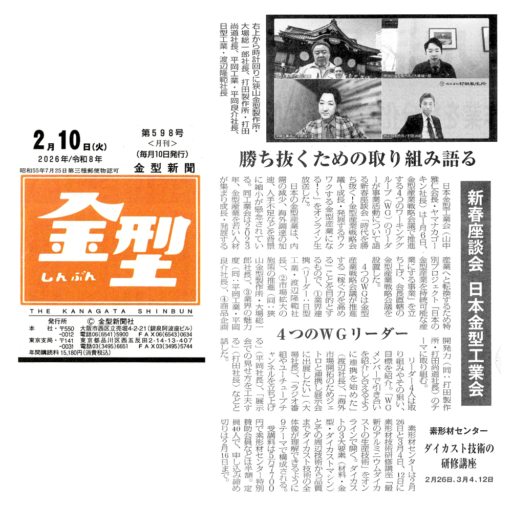 金型新聞社が発行する「金型しんぶん」に2026年1月6日にオンラインで行われた「新春金型座談会2026」の模様が掲載されました。ぜひご覧ください。 金型しんぶんONLINEホームページ → https://kanagata-shimbun.com/ |